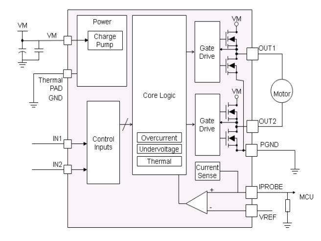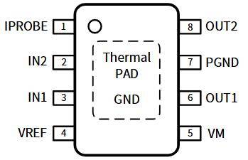 第一层:电流采样路径。芯片内部集成高精度电流镜像电路,通过低侧MOSFET采样流经电机的电流,按固定比例(AIPROBE=1.5mA/A)缩放后从IPROBE引脚输出。在IPROBE引脚外接一个电阻RIPROBE到地,即可将电流信号转换为电压信号VIPROBE。由于电流镜像直接采样自功率管内部,无需在功率回路中串联昂贵的精密采样电阻,不仅节省了BOM成本,更避免了采样电阻上的额外功率损耗。