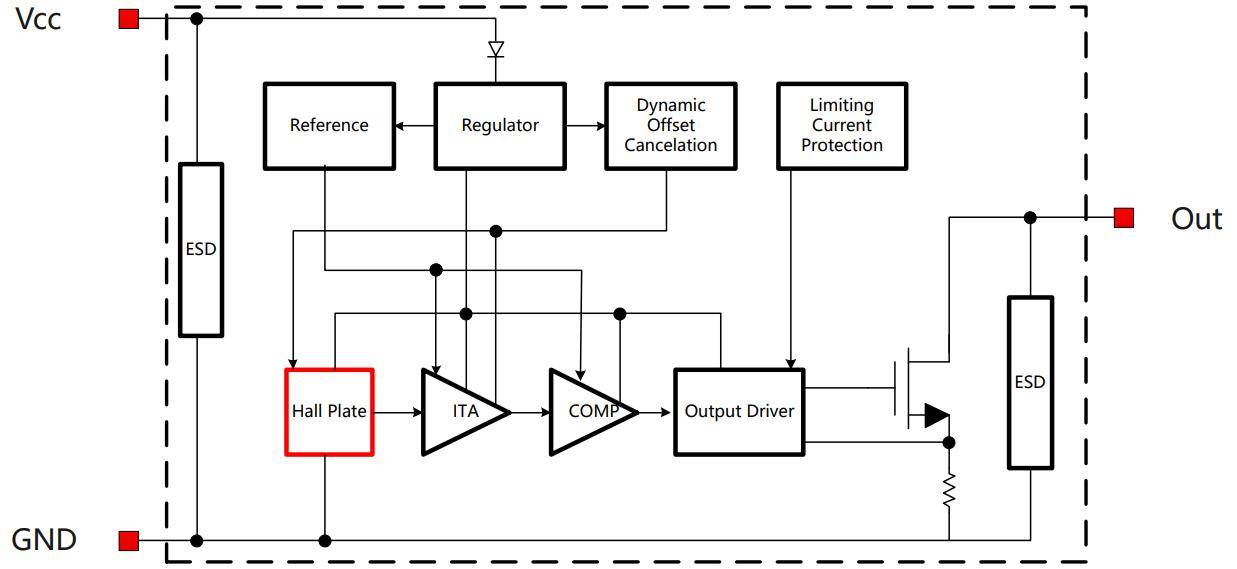 霍尔效应锁存器 | 感知磁场磁极 | 南极靠近输出低,北极靠近输出高,具有锁存功能 |