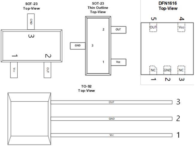 MT8762的设计考虑了工程师的实际需求,提供简洁的应用电路。典型应用仅需少量外部元件:一个电源去耦电容(推荐100nF)和一个输出上拉电阻(推荐4.7KΩ至10KΩ)。这种简化的设计大大缩短了产品开发周期,降低了系统成本。同时为满足不同应用场景的需求,MT8762提供多种封装选项:SOT-23:适合空间受限的表面贴装应用;SOT-23薄型轮廓:更低剖面高度,适配超薄设备;DFN1616:超小尺寸封装,适合高密度PCB设计;扁平TO-92:通孔安装,适配传统穿孔PCB工艺。所有封装均符合RoHS标准,满足环保要求。