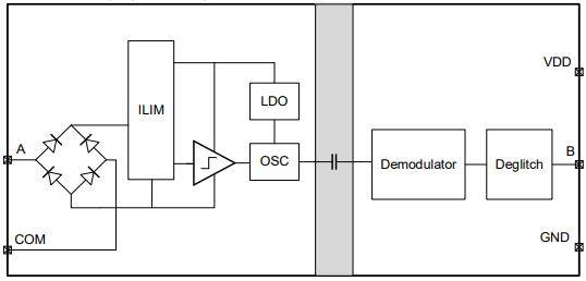 - 无需现场侧电源,外部电路只需一个电阻,用于配置输入侧阈值电压,易于设计和计算;
