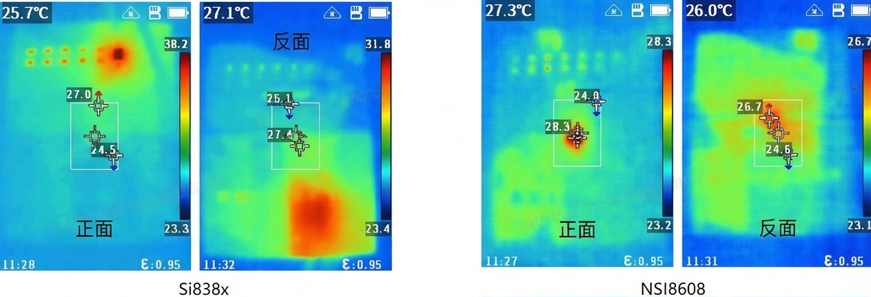 - 而NSI8608内置集成限流方案,测试中芯片本体与外围电阻的最高温度仅约28℃,无论是整体温升还是局部热点控制,均优于同类竞品。