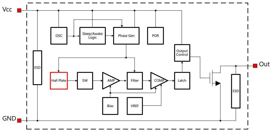 全极型霍尔开关,也称为无极性霍尔开关,是一种对磁场南极(S极)与北极(N极)均能响应的霍尔效应传感器。其核心工作特点为:任意磁极靠近,当磁场强度超过工作阈值(BOP)时,输出导通;当磁场移除,强度低于释放阈值(BRP)时,输出关闭,无需特定磁极触发,可以将它形象比喻为“从任意方向靠近都能响应”的感应门。具有体积小、灵敏度高、寿命长、可靠性强等优点,广泛应用于电子、电力、仪器仪表、汽车、通信等领域。