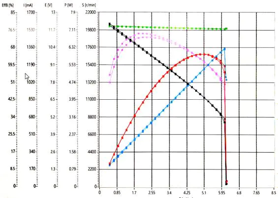 - 转速与扭矩关系:随着扭矩增大,电机转速呈下降趋势(例如9mN.m对应22000RPM,1.7mN.m对应8800RPM等),扭矩-转速曲线线性度良好。