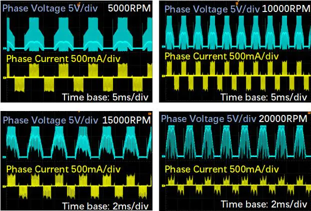 无负载条件下,电机在不同转速区间(5000RPM、10000RPM、15000RPM、20000RPM)的相电压与相电流波形均保持稳定对称。其中,相电压量程为5V/div,相电流量程为500mA/div,时间基准根据转速适配(5ms/div或2ms/div),体现出优异的运行一致性与电气稳定性。