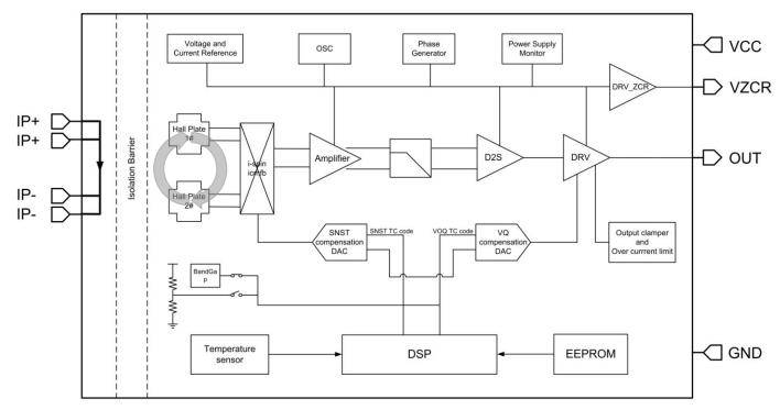 MT9523内部核心由采用CMOS工艺的霍尔芯片构建的低偏移斩波稳定型线性霍尔电路、内置低插入电阻的电流导体路径、信号调理与温度补偿单元构成,基于霍尔效应原理,将流经芯片的电流产生的磁场,线性转换为与输入电流成比例的电压输出信号。