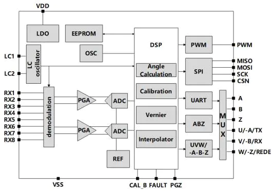 • 智能解算:强大DSP核心执行补偿、校准、角度求解(细分/粗分)、游标计算,合成高精度绝对角度值;