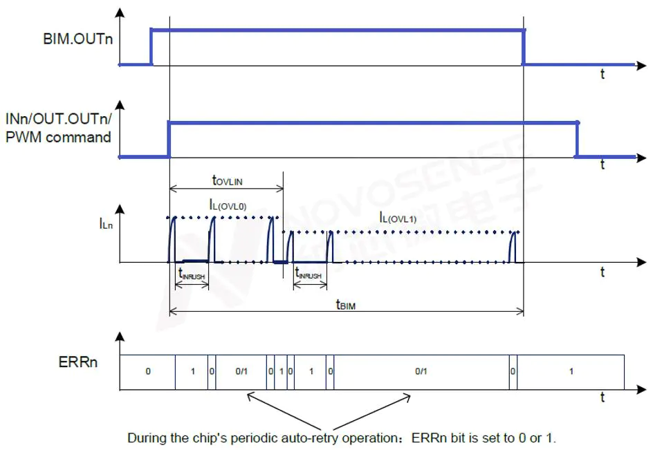 为解决这一痛点,NSD56xxx-Q1系列选择和DRV81242-Q1一样,集成Bulb Inrush Mode(灯泡浪涌模式)。当该通道输出达到过载保护阈值而被关闭时,该通道会在tINRUSH时间后自动重启,然后不断重复直至持续时间tBIM(40ms)。40ms内足够让2W功率的灯泡点亮,若同时采用BIM模式和通道并联功能,则可以支持将5W灯泡点亮。