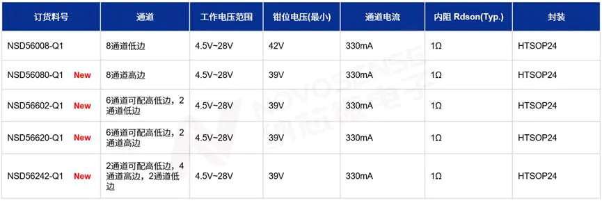 同样作为汽车应用电子产品,NSD56xxx-Q1系列8通道智能高低边驱动产品满足AEC-Q100 Grade1标准,工作温度范围覆盖-40℃至125℃,封装采用HTSOP24(8.65×3.9mm)。车规级可靠性加上全面的高低边组合、丰富的智能功能,纳芯微可为车身电子的各类型负载驱动提供多通道高集成度的解决方案,并且该系列已全部量产,帮助客户快速搭建安全可靠、灵活高效的系统设计。