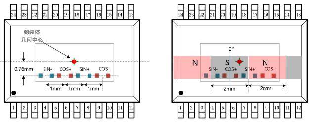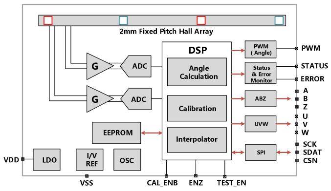 • 当对应极距为2mm的磁栅尺或磁环(需适配2mm固定极距、4mm固定对极的径向充磁规格)从芯片内集成的固定2mm极距的霍尔感应阵列上方经过时,霍尔阵列会随磁栅尺的移动或磁环的转动,输出两路正余弦模拟电压信号;