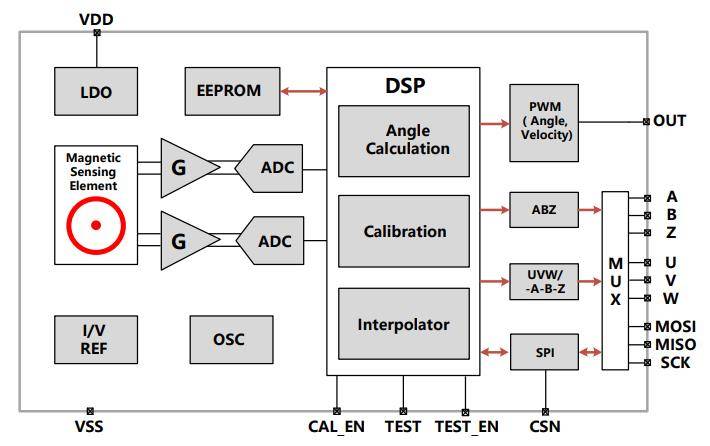 此外,MT6835内部还集成了低压差稳压模块(LDO)、时钟振荡器(OSC)和电可擦除可编程存储器(EEPROM)等完整功能模块。