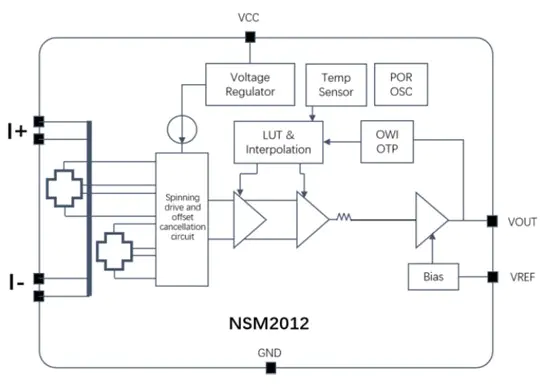第一,卓越的精度与稳定性。NSM2012在-40℃至125℃的宽工作温度范围内,可实现±1.5%至±3.5%的典型精度,且无需用户二次编程或校准。这得益于其内部创新的“旋转电流”激励技术和先进的温度补偿算法+工厂精度校准,有效抑制了霍尔器件固有的零点漂移和灵敏度温漂问题,减少了系统校准需求与维护成本。