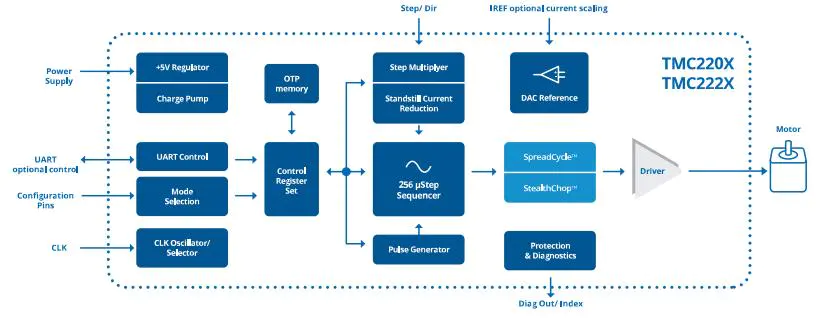 在接口设计上,TMC2224提供STEP/DIR和UART两种控制接口。STEP/DIR接口无需软件配置,直接接入MCU的GPIO,支持双沿触发(DEDGE 模式),适合快速替换传统驱动,如打印机升级等,确保了与传统系统的兼容性。而UART接口则为系统提供了更高的灵活性和可配置性,支持通过串行接口进行精细的参数调整和实时监控,满足不同复杂度的应用的需求。
