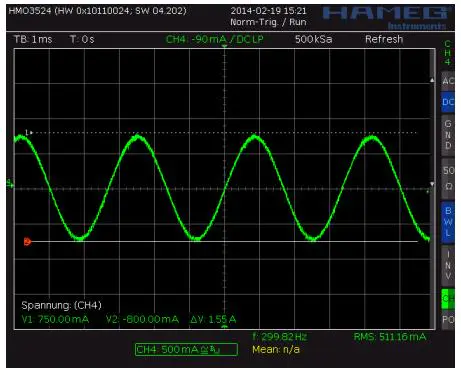 使用StealthChop的电机线圈正弦波电流(电流探头测量)