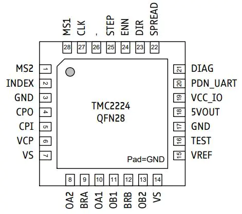 | 物理特性 | 封装:QFN28(5mm×5mm,0.5mm 引脚间距);工作温度:-40℃~125℃ | 适配狭小空间(如3D打印机挤出机),工业级宽温 |
