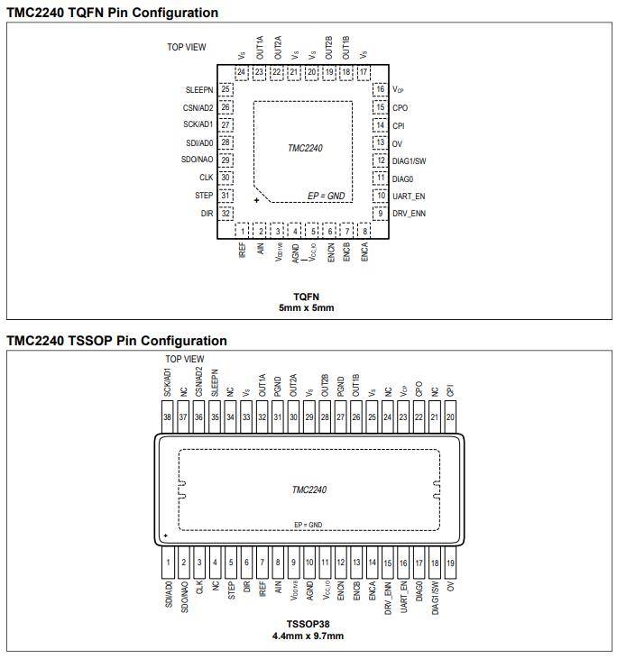 TMC2240提供TQFN32(5×5mm)超小尺寸封装,适配紧凑型设备与高密度PCB设计。同时,也提供便于手工焊接的TSSOP38(9.7×4.4mm)封装,降低了原型开发与小批量试产的门槛,兼顾研发便捷性与量产实用性。