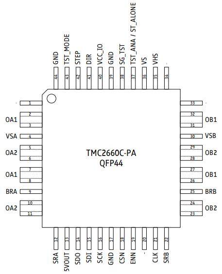 TMC2660C是一款高度集成的两相步进电机驱动器IC,是前代产品TMC2660的C型升级款,遵循“用芯片级的智慧,解决系统级的难题”的设计理念,将大功率MOSFET、先进控制逻辑和智能诊断算法全部封装进一个44引脚的QFP芯片中。它支持从5V至30V的宽电机电源电压,并能提供高达2.2A RMS的连续相电流,足以驱动绝大多数中小型步进电机。
